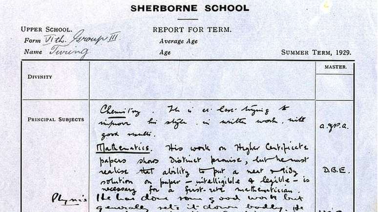 O boletim, de 1929, é de Alan Turing, uma das mentes mais brilhantes do século 20, o cientista britânico considerado o pai da computação e visionário da inteligência artificial que conseguiu decifrar a linguagem secreta usada pelos nazistas, contribuindo assim para encurtar a Segunda Guerra Mundial.