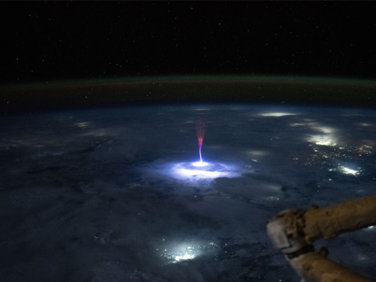 Estamos falando dos "gigantic jets" ou "jatos gigantes", um fenômeno peculiar que só foi observado e estudado há 25 anos. Ele ocorre principalmente durante tempestades e se estendem para cima em direção à ionosfera da Terra, em um raio de coloração vermelha, azul e branca.