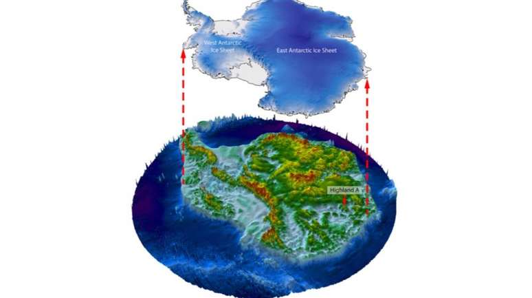 Pesquisadores utilizaram dados de satélite e técnicas de eco-sondagem para mapear uma área de 32 mil quilômetros quadrados de terra sob a vasta camada de gelo
