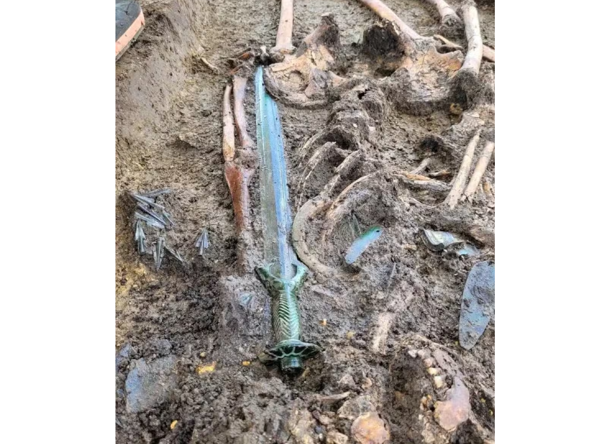 A espada foi localizada ao lado dos restos mortais de um homem, em uma sepultura que também continha os esqueletos de uma mulher e de uma criança, além de outros objetos de bronze possivelmente ligados a rituais funerários. O contexto chamou atenção dos pesquisadores porque muitas tumbas da região foram saqueadas ao longo dos séculos, o que torna a preservação do artefato ainda mais inacreditável.