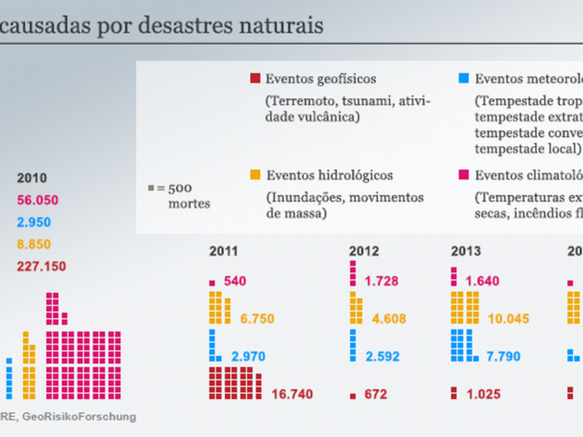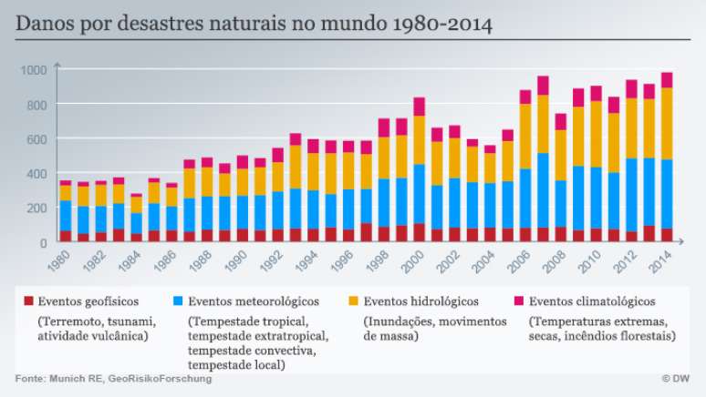 O ano de 2014 registrou um recorde com 980 desastres naturais, bem mais do que a média da década anterior (830) ou em relação aos últimos 30 anos (640). "Certamente, isso se deve, por um lado, às mudanças climáticas, mas também ao fato de que hoje tais eventos são muito mais fáceis de se observar", explicou à DW Stefan Straub, do Departamento de Mudanças Climáticas e Energias Renováveis da Munich Re.
