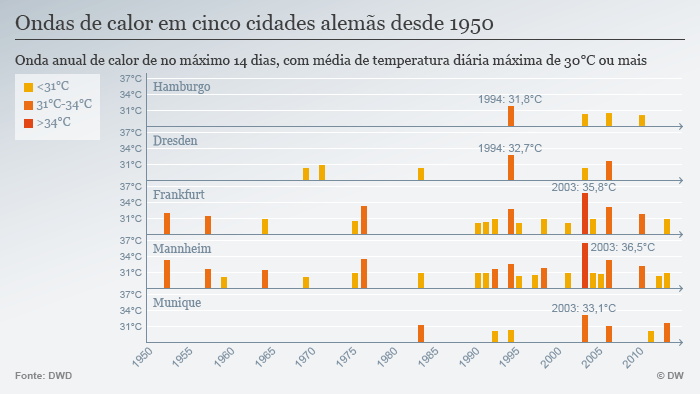 Segundo os climatologistas, nesse ponto se pode observar que, desde a década de 1990, por exemplo, as ondas de calor aumentaram consideravelmente nas cidades alemãs. "Mais uma vez, isso é algo que se pode atribuir claramente ao aquecimento global", afirmou Imbery. E o aumento da frequência e da intensidade de períodos de calor é considerado algo praticamente certo.