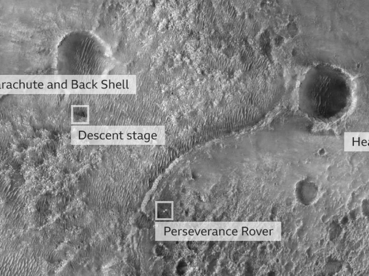 A primeira imagem da Perseverance na superfície foi tirada pela câmera High Resolution Imaging Experiment a bordo do Mars Reconnaissance Orbiter da Nasa