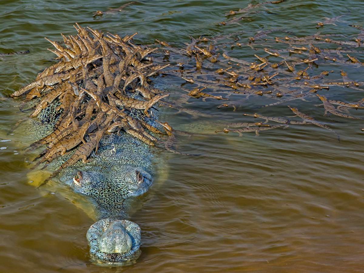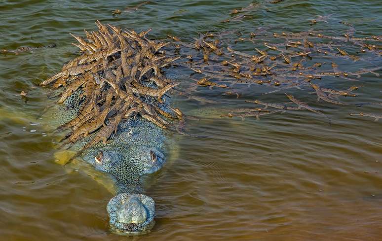 Fotografia que mostra macho da espécie gavial com filhotes é finalista da competição Wildlife Photographer of the Year.
