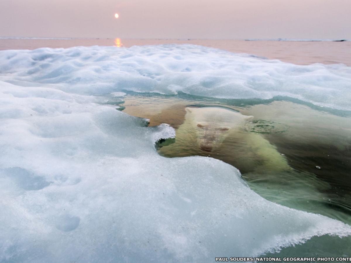Esta incrível imagem de um urso polar emergindo do mar congelado na baía de Hudson, do fotógrafo Paul Souders, ganhou o prêmio principal no concurso de fotos deste ano da National Geographic