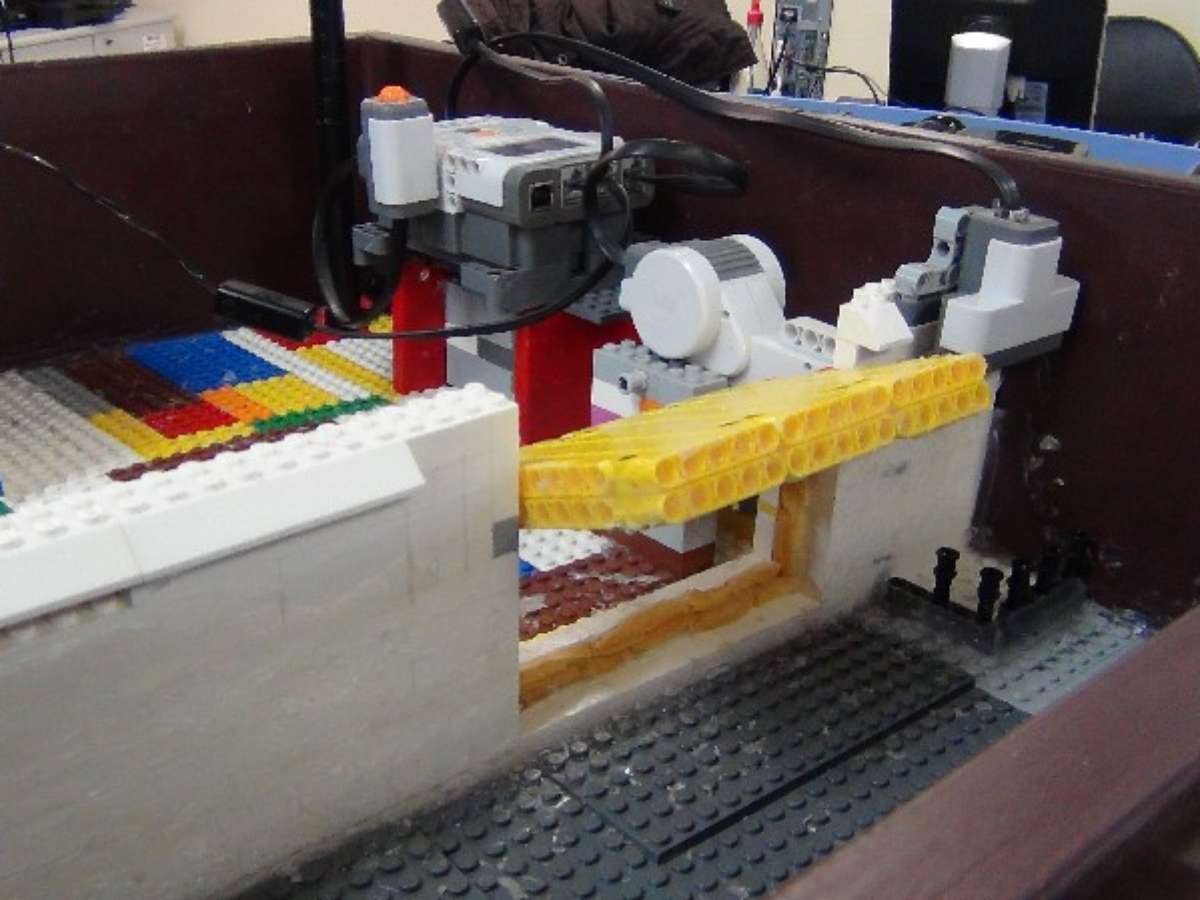 Para atender ao desafio, um grupo misto de alunos da 7°, 8° e 9° ano do ensino fundamental usou as peças de Lego para montar a maquete de uma residência com um portão com sistema de vedação entre a estrutura e o piso da garagem, visando evitar a passagem da água.