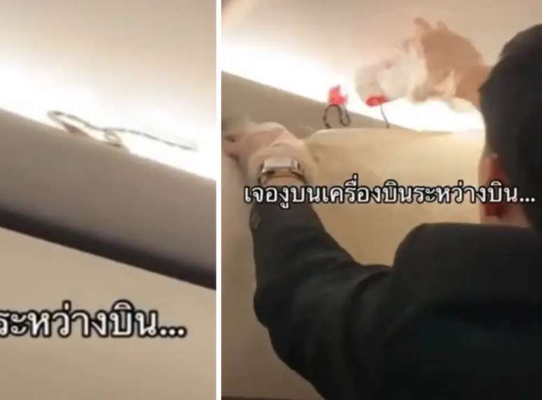 As imagens mostram a serpente se movimentando acima do compartimento enquanto um membro da tripulação tenta capturá-la usando uma garrafa de água.