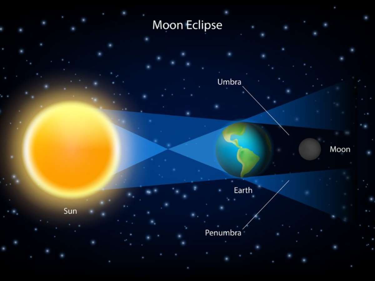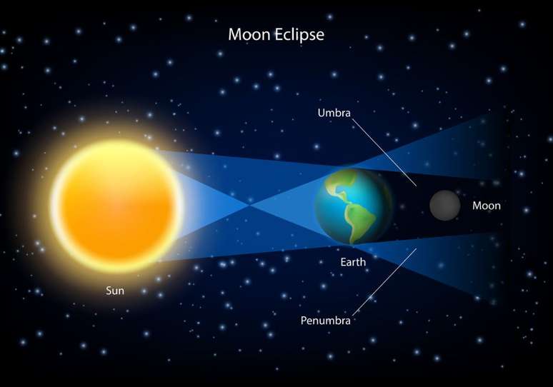O eclipse lunar acontece quando a Terra, Lua e o Sol se alinham no espaço e dessa forma, a sombra do nosso planeta é projetada na superfície lunar. Quanto a sombra é clara e recebe luminosidade do Sol, ela é chamada de penumbra, já quando a sombra é escura e sem luminosidade solar temos a umbra.