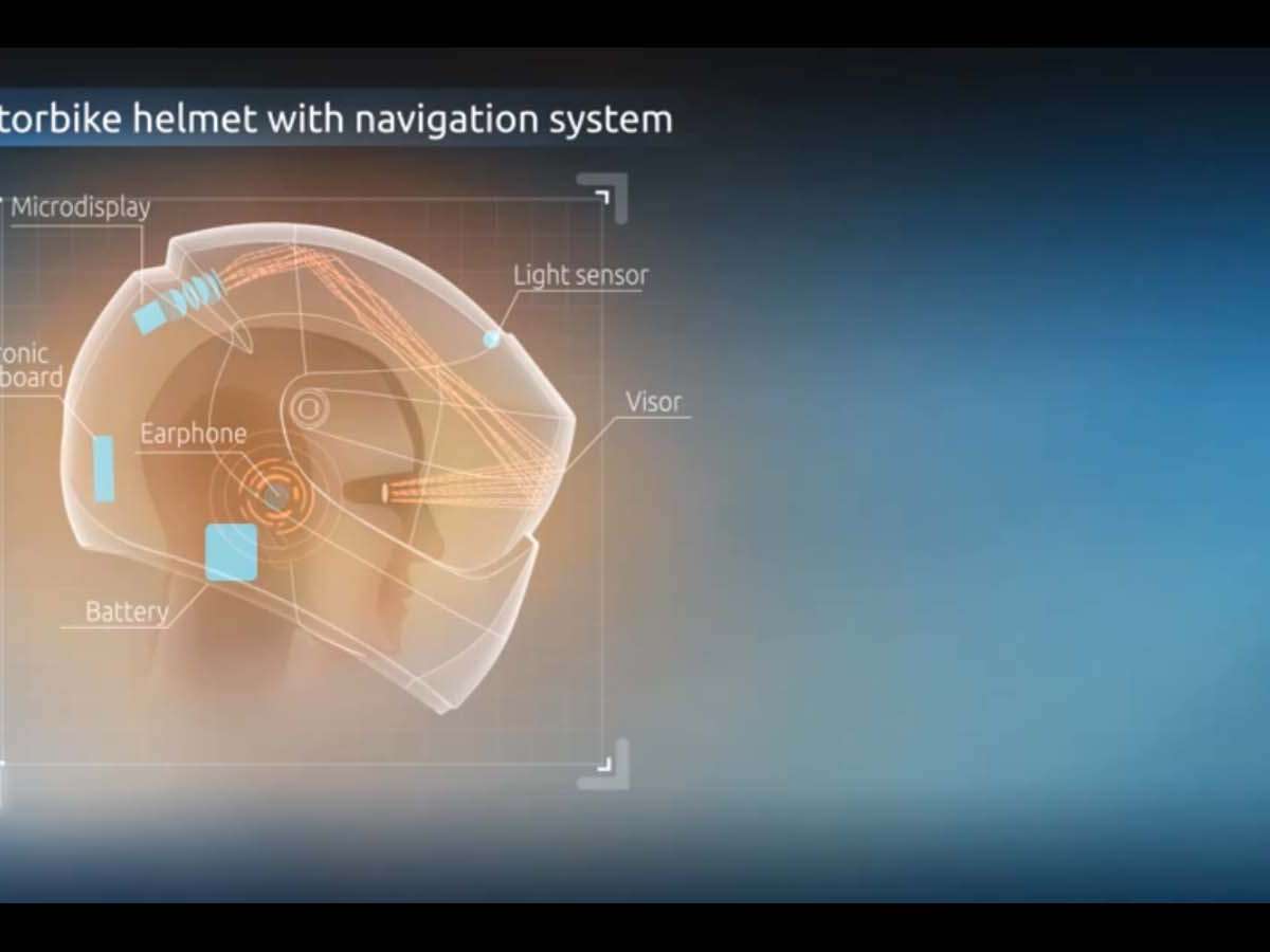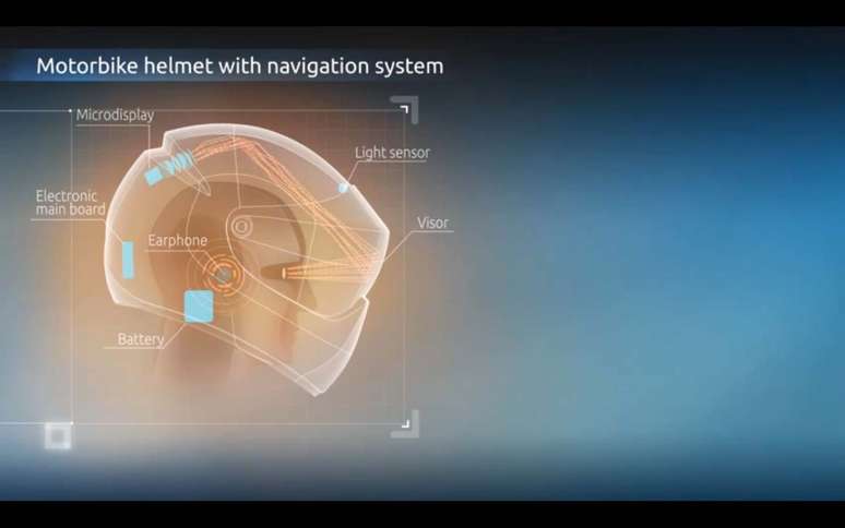 Motociclista conta com várias funções no capacete, como sensor, giroscópio e bússola digital para rastreamento de movimento da cabeça (a imagem muda de acordo com a direção da vista)