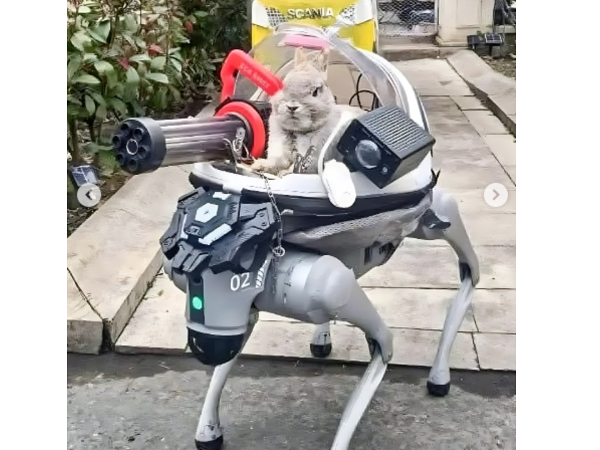 Já imaginou estar andando pelas ruas e encontrar um coelhinho dirigindo uma "máquina de guerra"? Pode parecer algo impossível, mas isso realmente aconteceu na China. Um homem decidiu modificar um cão robô Go2 para o seu coelho de estimação, proporcionando uma cena digna de filme. E como se já não fosse incomum o suficiente ver um coelho dirigindo um veículo, a transformação deixou o robô muito parecido com uma máquina de batalha, equipado com cockpit, alto-falantes e até uma metralhadora. Com esse presente um tanto quanto inusitado, o coelho desfila pelas ruas como se estivesse preparado para a guerra.