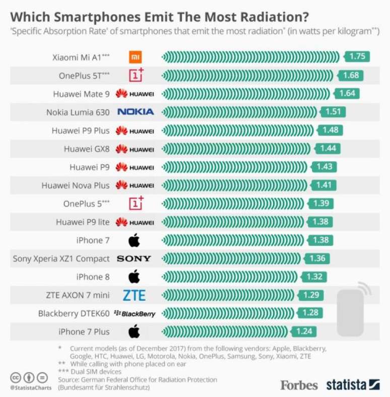 De acordo com a pesquisa, o modelo emite 1,75 watts por quilograma de radiação na medida Specific Absorption Rate (SAR). Logo em seguida temos o OnePlus 5T (1,68), o Huawei Mate 9 (1,64), o Nokia Lumia 630 (1,51) e o Huawei P9 Plus (1,48). É interessante notar que a maioria dos aparelhos são chineses; de acordo com o ranking, o gadget menos radioativo da pesquisa foi o já ultrapassado iPhone 7 Plus (apenas 1,24 watts por quilograma).