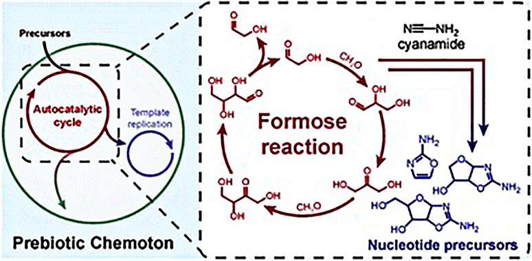 Um dos melhores exemplos de reação autocatalítica que poderia ter acontecido na Terra primitiva foi a chamada "reação de Formose", proposta em 1887 pelo químico russo Nikolay Zelinsky. Nela, um composto simples chamado glicolaldeído (feito de hidrogênio, carbono e oxigênio) resulta em duas células, após o acréscimo de outro composto simples chamado formaldeído (o Formose).