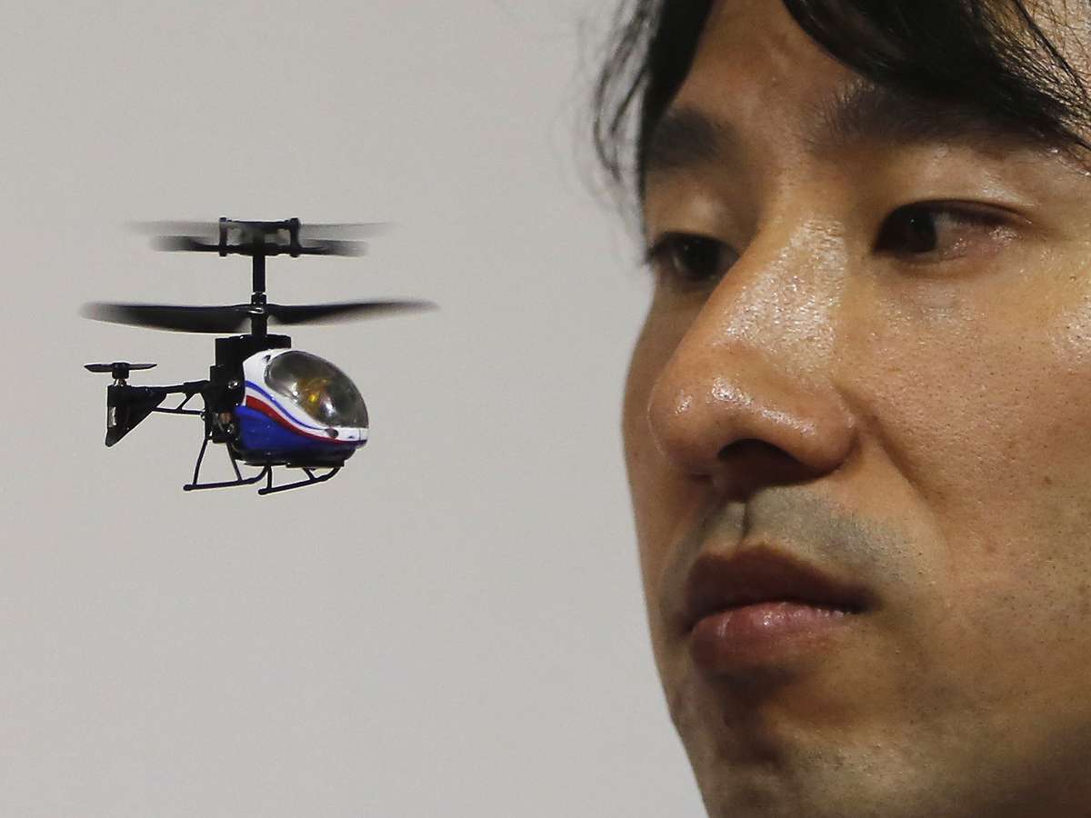 Funcionário da fabricante de brinquendos japonesa CCP Co controla o Nano-Falcon, considerado o menor helicóptero controlado por controle remoto do mundo, em uma feira em Tóquio