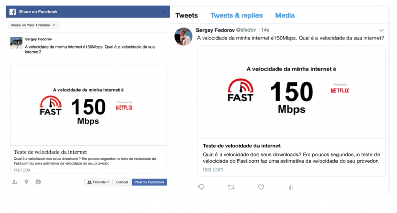 Agora, comemorando o marco histórico do FAST.com, a Netflix está lançando uma novidade: o usuário pode compartilhar os resultados de seus testes nas redes sociais para todo mundo ver. Seja para contar vantagem por sua internet de altíssima velocidade, ou para reclamar publicamente de problemas relacionados à conexão, basta fazer o teste normalmente e, após os resultados, clicar no botão do Facebook ou Twitter para fazer o compartilhamento.