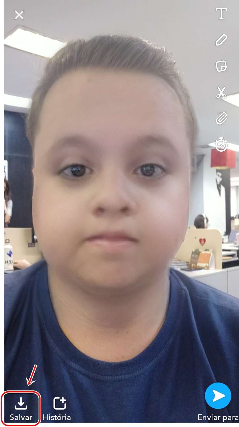 Agora é só você fazer fotos ou vídeos com essa lente do Snapchat. Quando você termina a captura, um botão para "Salvar" o conteúdo aparece no fundo. Esse botão manda um arquivo para sua galeria, de onde outros apps conseguem importar facilmente as imagens.