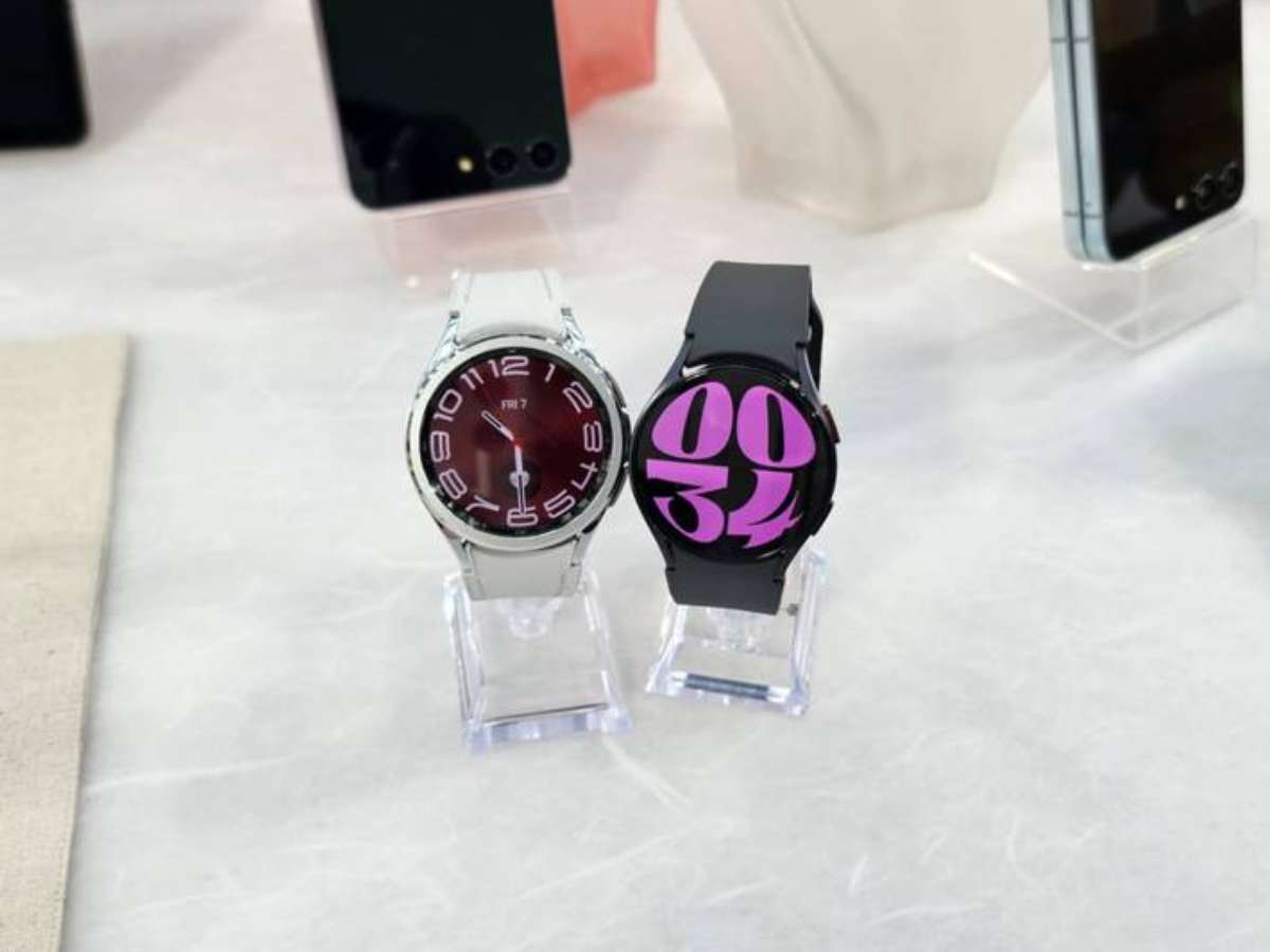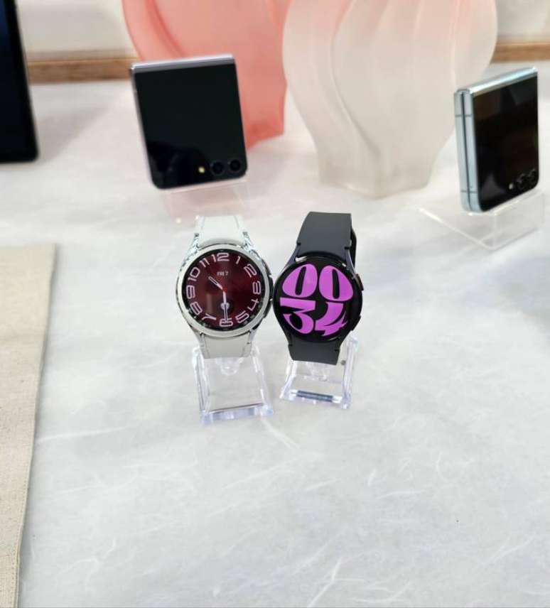 Nos relógios inteligentes, dois novos modelos compõem a nova linha do Galaxy Watch 6: uma versão tradicional e uma clássica, que possui uma coroa giratória em volta do display para "imitar" um acessório analógico.