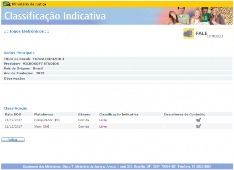 A informação foi disseminada originalmente no fórum Resetera, no qual um dos usuários divulgou uma screenshot do site do Ministério da Justiça brasileiro de classificação indicativa, listando Forza Horizon 4 para Xbox One e para PCs. Confira logo abaixo: