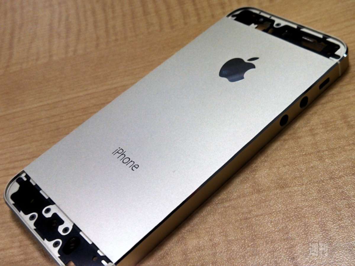 Inscrição "iPhone" na parte de trás das fotos vazadas mostra um fonte mais fina, alinhada com a tipografia do iOS 7. Imagem mostra comparação do novo iPhone dourado com as versões preta e branca do atual iPhone 5
