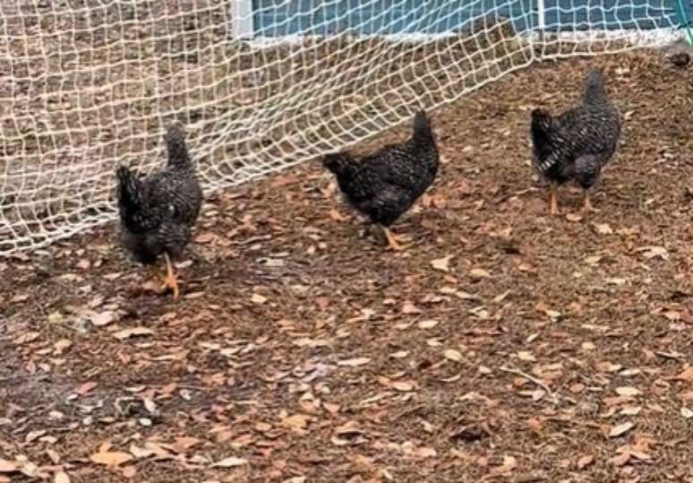 "Tinha um gavião em cima delas. Infelizmente, o mesmo gavião que diminuiu o meu grupo de 10 para 5 galinhas", conta a dona das galinhas no vídeo.