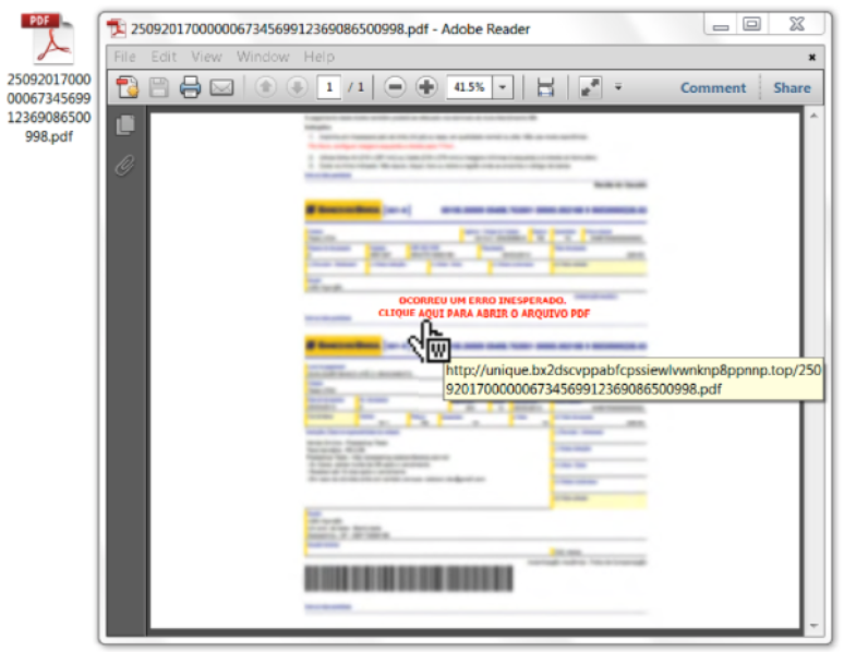 O anexo em PDF apresenta erro que leva o usuário a achar que o problema é na rede dele. As mensagens orientam a continuar o processo: "Ocorreu um erro inesperado. Clique para abrir o arquivo PDF". É nesse momento que o golpe acontece, quando o remetente clica no hiperlink presente está no corpo do e-mail. A conexão direciona para uma URL que instala o malware.