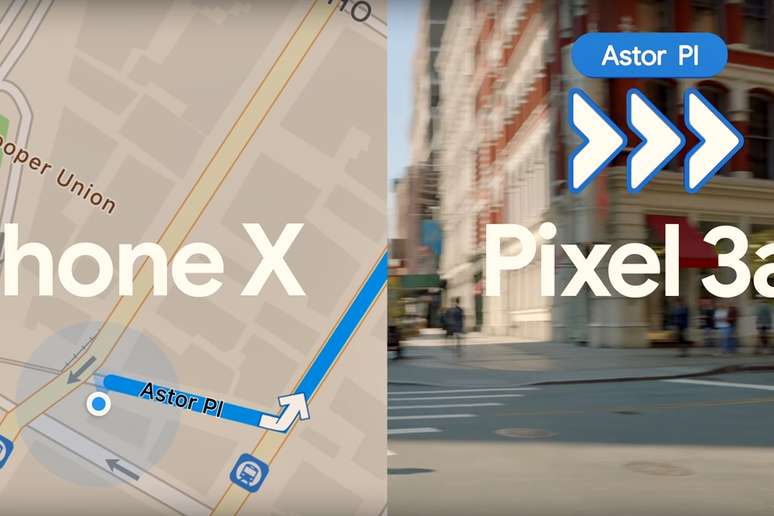 O anúncio compara o Apple Maps em um iPhone X com o Google Maps no Pixel 3a. Enquanto fica difícil se situar e saber a exata posição em tempo real no smartphone da Maçã, o dispositivo da Gigante de Mountain View mostrar os nomes das ruas e setas de orientação "ao vivo", com ajuda da realidade aumentada sobre as próprias imagens do local.