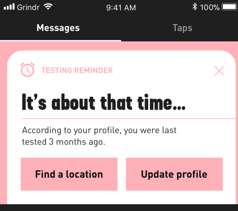 A ferramenta do Grindr não é um mero lembrete para que as pessoas façam exames. Em associação com a organização CenterLink, o aplicativo está cedendo espaço de publicidade gratuita para locais que fazem testagem de HIV e outras ISTs, para tornar a tomada de decisões em fazer o exame mais prática para os usuários.