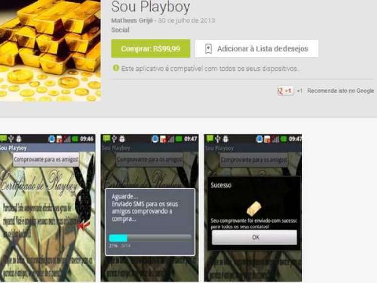 Lançado esta semana, o aplicativo Sou Playboy, disponível para donwnload na Google Play tem a função de enviar, por SMS, um “certificado de playboy". A ideia do app, é de que não basta ter dinheiro, é preciso mostrar, ostentar a riqueza para os amigos. O app pode ser baixado por R$ 99,99.