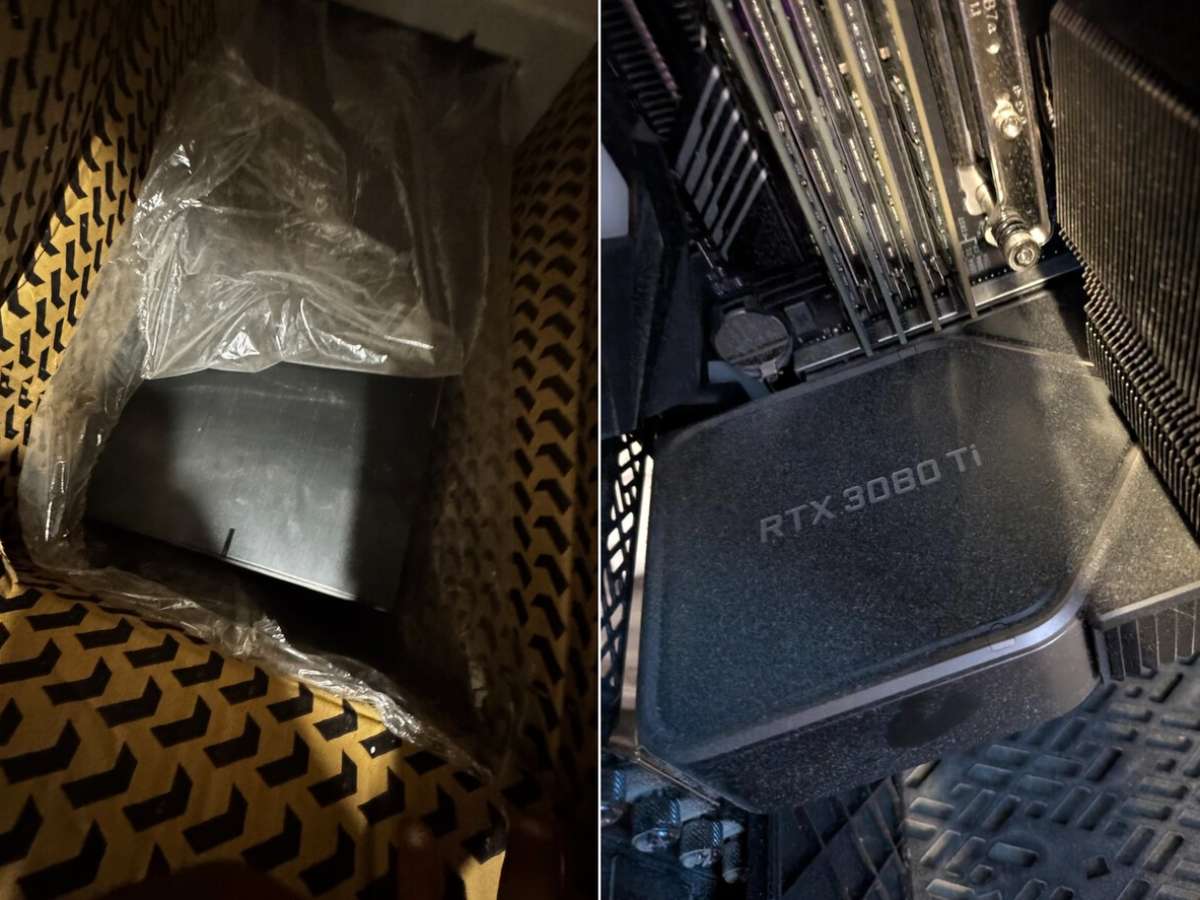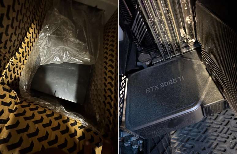O comprador publicou a descoberta na comunidade r/pcmasterrace. Segundo imagens compartilhadas por "LlamadeusGame", a caixa não estava vazia nem continha peças antigas, mas sim um computador completo de alta performance. Nas fotos, é possível ver uma placa-mãe TRX40 AORUS Pro WiFi com um processador AMD Ryzen Threadripper 3960X de 24 núcleos, acompanhado de 256 GB de memória RAM e uma placa de vídeo NVIDIA GeForce RTX 3080 Ti. Embora o interior mostrasse acúmulo de poeira, a captura de tela compartilhada pelo usuário indica que o sistema funciona e reconhece todo o hardware.