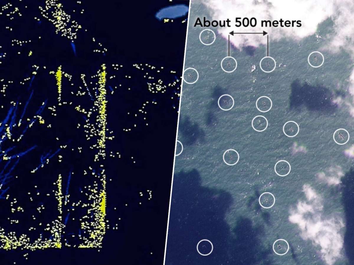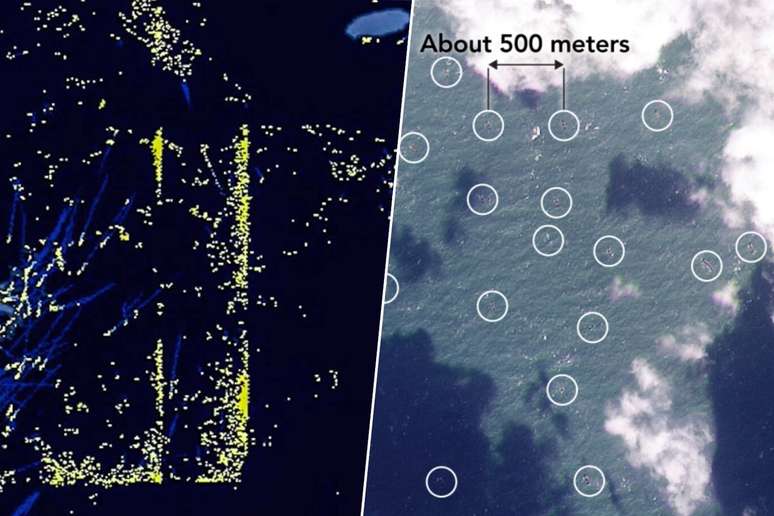 Dados do AIS e imagens de satélite mostram concentrações sem precedentes de até 2 mil barcos de pesca chineses alinhados perto da linha mediana entre os dois países no Mar da China Oriental.