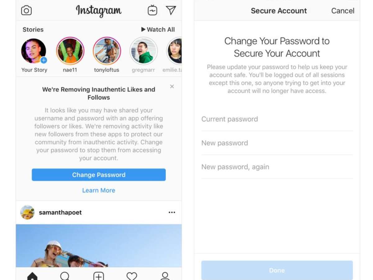 Perfis que forem identificados usando esses serviços receberão uma notificação no próprio app, dizendo que a atividade falsa foi removida. O usuário também terá que mudar a senha. Segundo o Instagram, muitos usuários acabam compartilhando suas senhas com as plataformas de terceiros e isso abre uma brecha para que esses perfis também realizem atividades falsas - isso sem contar outras questões de segurança.