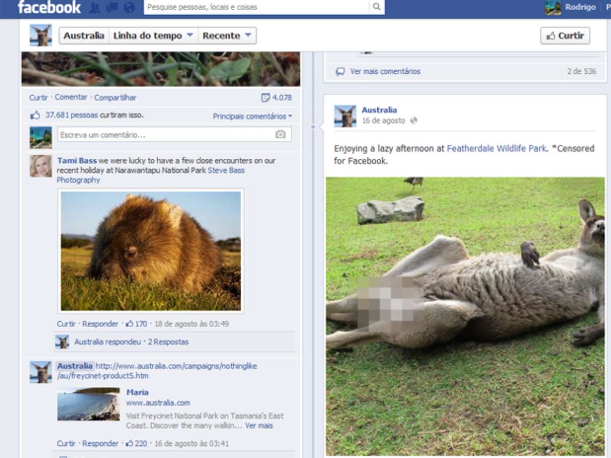 A página do Facebook da Austrália foi alvo de críticas após ter "censurado" uma foto de um canguru em que aparecia as partes "íntimas" do animal. O post com a foto teve mais de 5 mil compartilhamentos. Os comentários, na grande maioria, eram de indignação e deboche pela censura e pela legenda da foto: Censored for Facebook (Censurado para o Facebook)