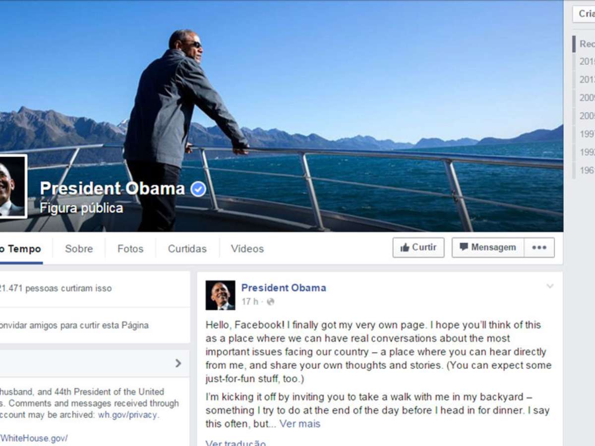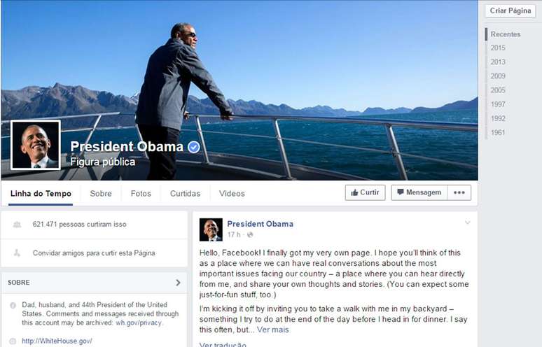 A página inclui ainda uma cronologia com fotos dos momentos mais importantes da vida e da carreira do governante, desde seu nascimento em 1961 até sua segunda posse como presidente, em 2013, passando pelo casamento com Michelle Obama, em 1992, e sua chegada ao Senado, em 2005.
