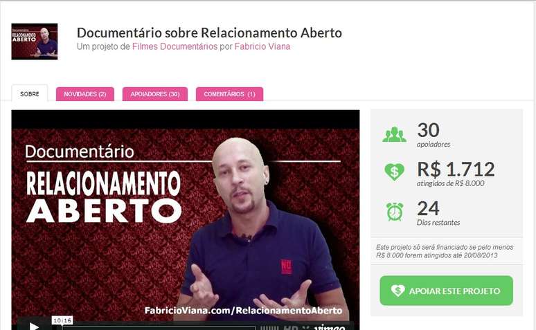Um documentário para mostrar o que são e como funcionam os relacionamentos abertos é o que pretende fazer o psicólogo de São Paulo Fabrício Viana, 35 anos. O filme será recheado de depoimentos, com captação de áudio e vídeo em alta definição, mas depende de verba. Por isso, Viana criou uma campanha em um site de financiamento coletivo.