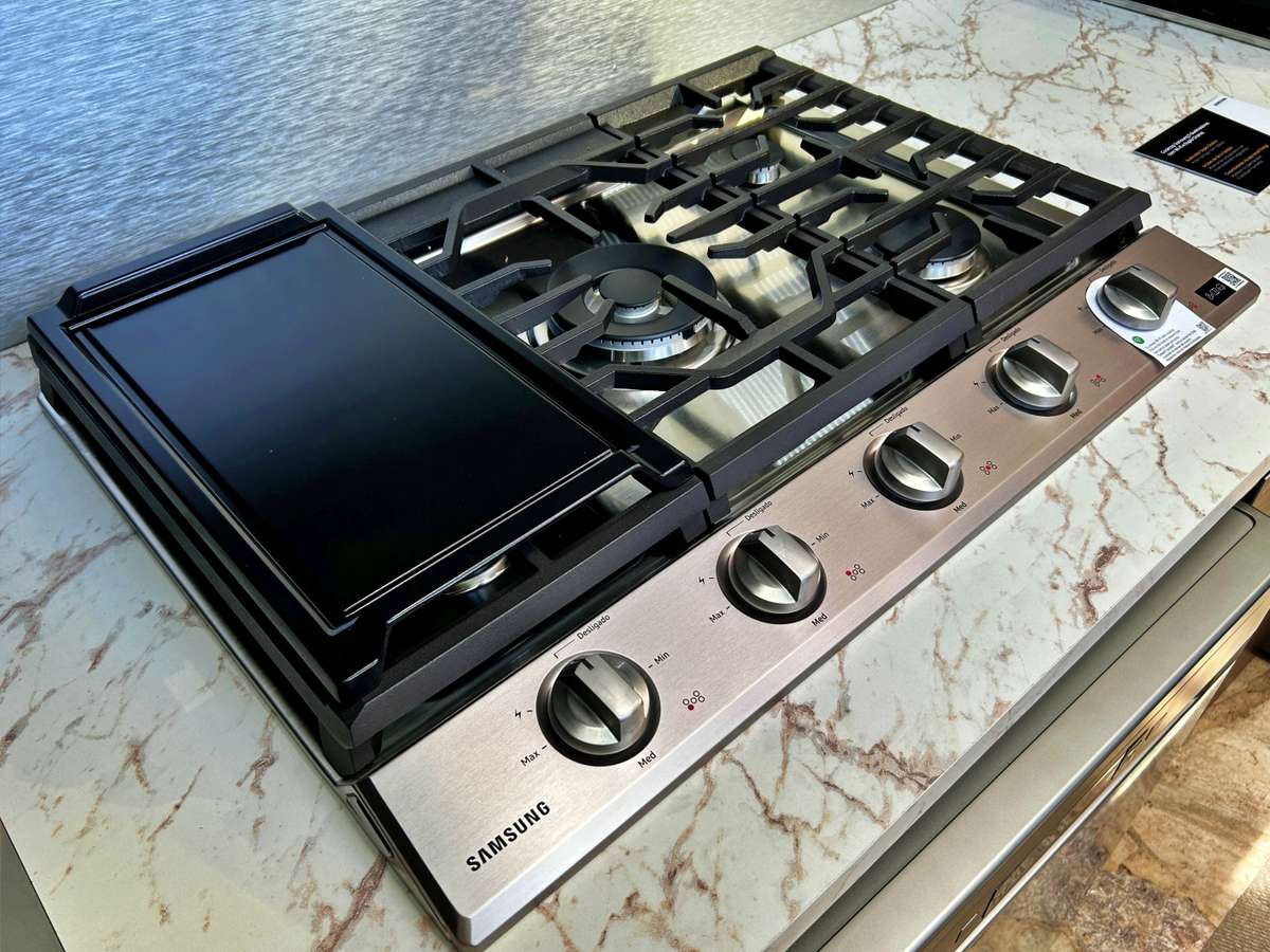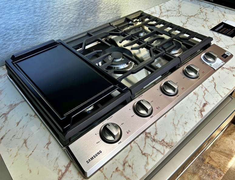 O cooktop da Samsung traz 5 bocas de tamanhos variados, todas com chama dupla e acendimento elétrico. As opções de cores incluem o tradicional inox prateado ou inox preto, e o aparelho é coberto por grades grandes com aspecto similar ao de um fogão industrial, prometendo grande estabilidade para panelas de todos os formatos e tamanhos. Além disso, ele vem com uma chapa de alumínio que pode ser colocada sobre as grades para preparo de alimentos como hambúrgueres, legumes e lanches, entre outros.