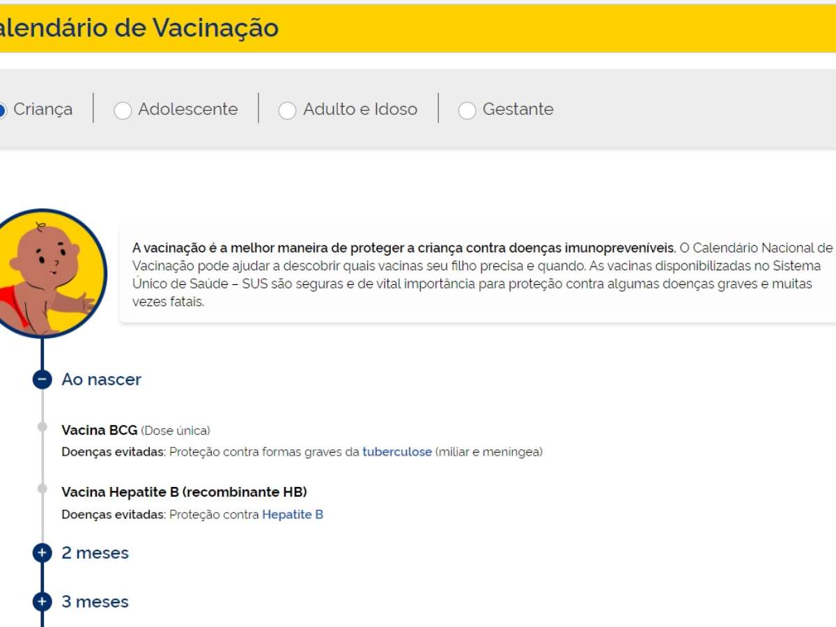 Trata-se de uma versão digital do Calendário de Vacinação, que pode ser consultado tanto em forma de site quanto visualizado em um arquivo PDF baixado no computador ou celular.