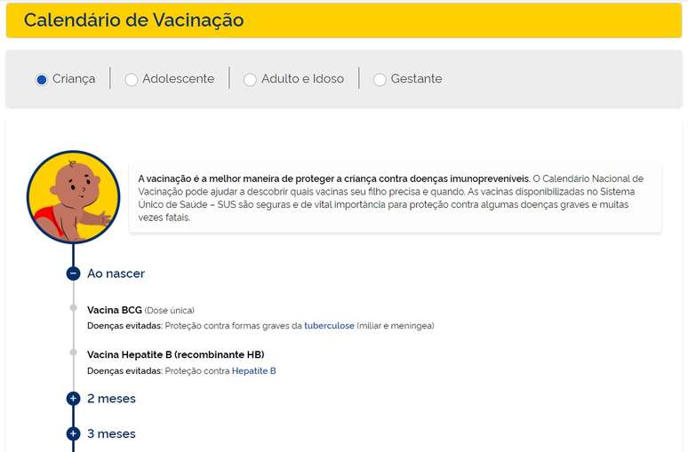 A página do Calendário Nacional de Vacinação é dividida pelas opções Criança, Adolescente, Adulto e Idoso ou Gestante. Ao clicar em uma categoria, é possível selecionar também a idade para ter acesso às vacinas sugeridas e disponíveis no Programa Nacional de Imunizações (PNI).