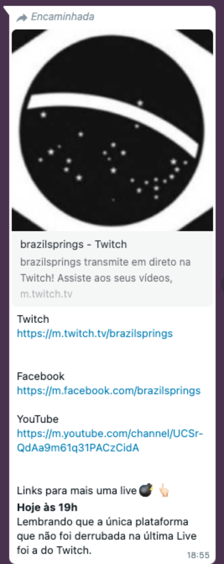 Algumas mensagens de grupos de direita no Telegram e no WhatsApp alegam que, na transmissão ao vivo realizada na segunda-feira (7.nov), a Twitch foi a única grande plataforma que não derrubou a live.