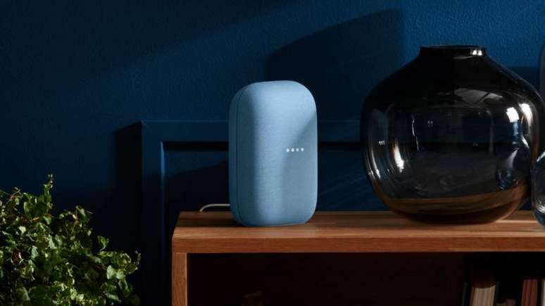 A caixinha conectada continua seguindo os padrões dos outros produtos, com revestimento de tecido, sem tela, e com algumas luzes de led. A diferença, no entanto, está na qualidade. O modelo é cotado para ter o melhor sistema de som da linha do Google, além de ser notavelmente maior que os anteriores — parecendo uma grande saboneteira, é verdade.