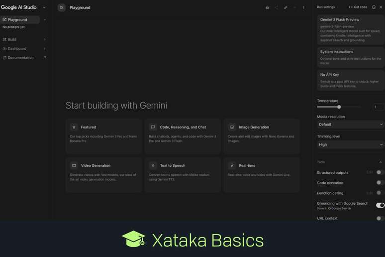 É como um ambiente de desenvolvimento com o SDK Gemini, mas com uma interface simples para que qualquer usuário possa utilizá-lo. É como ter o mecanismo Gemini à vista, com todos os controles expostos para que você possa ajustar, experimentar e construir suas próprias coisas, escolhendo entre vários modelos de inteligência artificial.