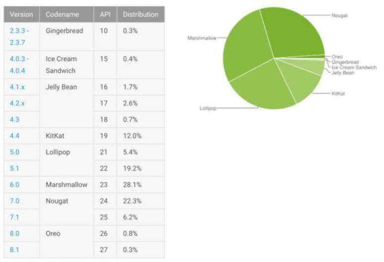O Android Oreo, a versão mais recente do sistema, por sua vez, faz parte de apenas 1,1% dos aparelhos móveis no mundo, algo que pode ser facilmente justificado devido ao período em que cada fabricante de smartphones e operadoras precisa para trazer as atualizações da Google para os seus respectivos dispositivos.
