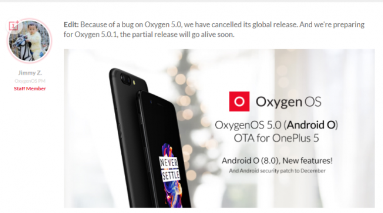 Depois de deixar muita gente animada com o lançamento da atualização que traz o Android Oreo para seus smartphones, a OnePlus cancelou a versão global do OxygenOS 5.0. A empresa diz que o cancelamento aconteceu devido a bugs no sistema.