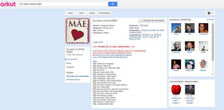Antes de xingar muito no Twitter, já se xingava muito no Orkut. E as reclamações tinham endereço certo: as comunidades e os fóruns. Neles se faziam e desfaziam amizades durante discussões acalorados sobre temas mais sérios, como preconceito e violência, e mundanos, como os rumos de uma série de televisão. Em 2008, auge da popularidade da rede social, a maior comunidade “Eu amo minha mãe”, tinha 4,5 milhões de membros.