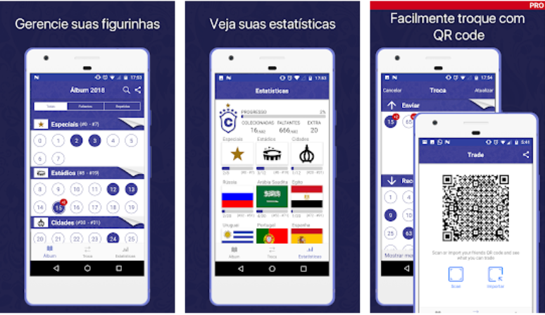 O aplicativo Figurinhas - Copa do Mundo 2018 permite o registro das figurinhas que o colecionador já tem, além das figurinhas repetidas. Além disso, a ferramenta possibilita o compartilhamento das informações com os amigos, bem como a troca de figurinhas via QR Code.