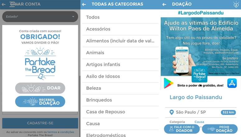 É aí que a tecnologia entra mais uma vez como ferramenta para a sociedade. Um aplicativo chamado Partake The Bread tem a proposta de unir pessoas que querem doar a outras que querem receber uma doação. Em tradução literal, o nome significa "partilhar o pão" e, embora tenha um título em inglês, a iniciativa é brasileira.