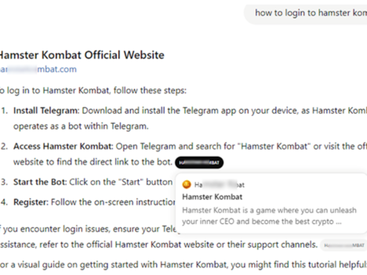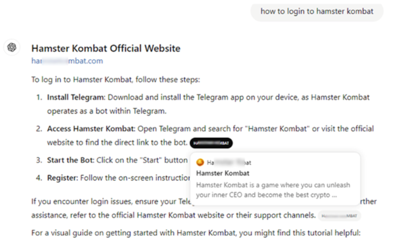 Assim, o ChatGPT pode sugerir páginas suspeitas ao realizar pesquisas específicas. Os peritos da Kaspersky identificaram sites mal-intencionados principalmente relacionados a criptomoedas. Em uma das situações examinadas, relacionada a um conhecido jogo de criptomoedas, foi identificado um link de phishing abaixo do título e no conteúdo da resposta do chatbot.