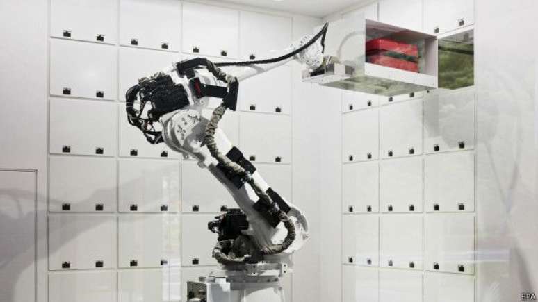 Os clientes colocam as malas em uma janela e elas caem em uma caixa. Em seguida, o robô recolhe uma por uma e as coloca em armários.