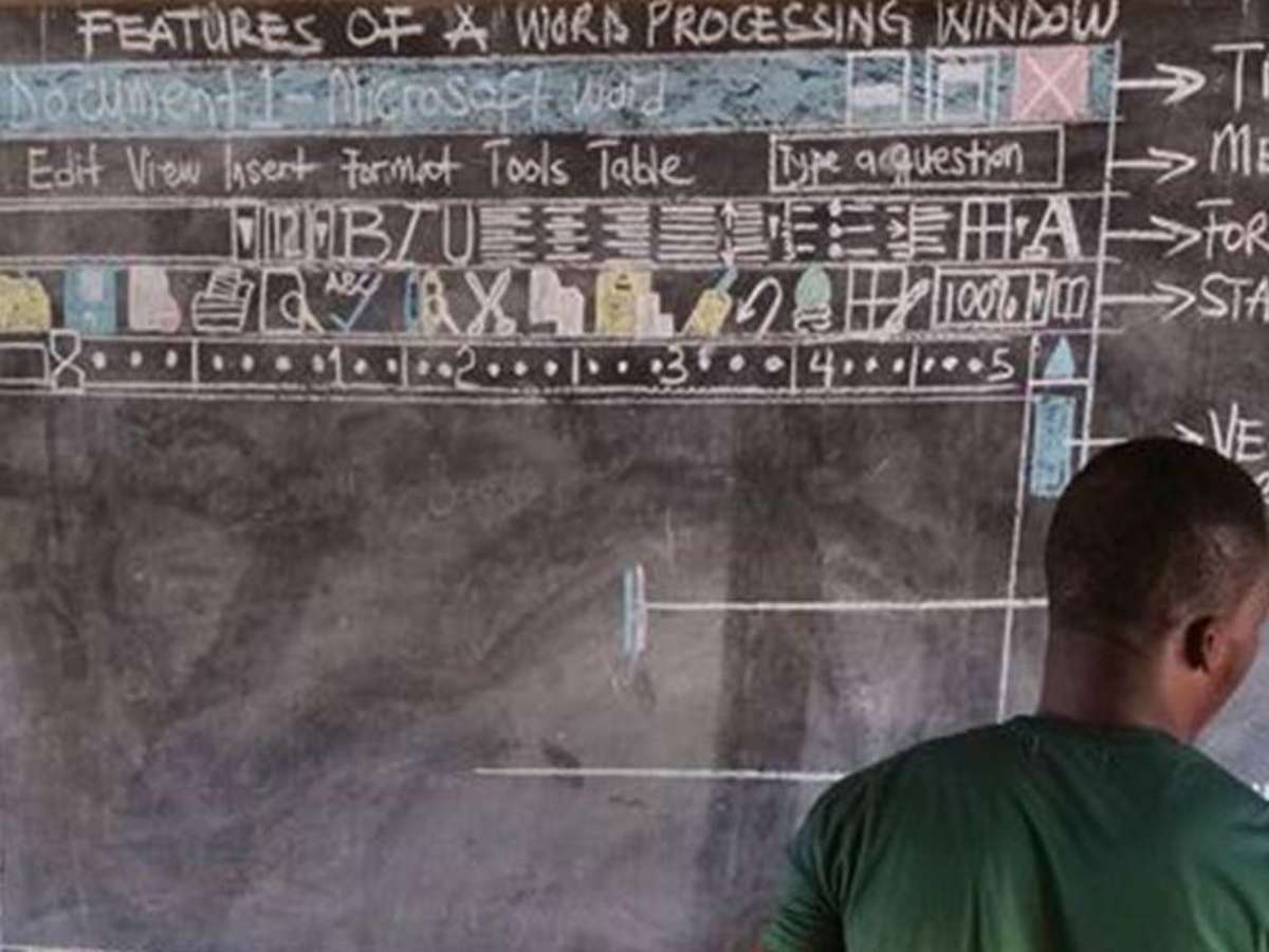 Um professor de Gana, na África, precisou improvisar com a criatividade nas suas aulas de Tecnologia de Informação e Comunicação: pela falta de computadores, ele está usando o quadro negro para desenhar o Microsoft Word para seus alunos.