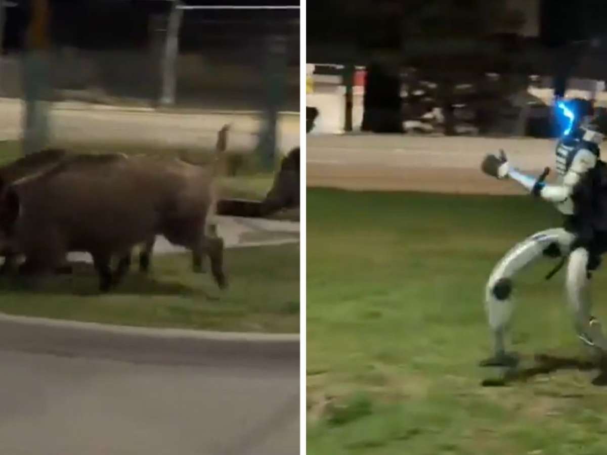 O robô é visto levando uma mochila, dando passos acelerados, avançando em direção aos javalis, que correm ainda mais rápido. Em alguns momentos, os animais se espalham pelas calçadas de uma área verde, mas voltam a se reagrupar com a aproximação do robô.