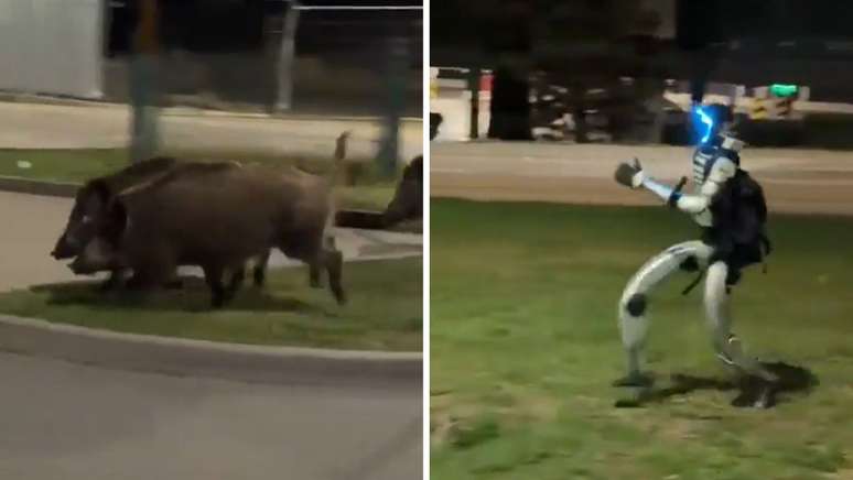Um robô humanoide bípede que emite luzes azuis é visto em um vídeo que circula nas redes sociais perseguindo javalis em uma área residencial de Varsóvia, na Polônia. Nos últimos dias, as imagens circularam na rede social X e chamaram a atenção dos usuários.