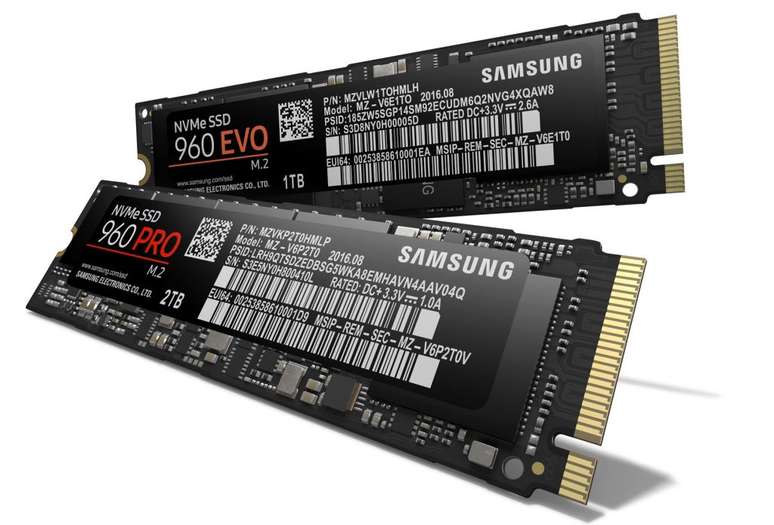 Enquanto o 960 Evo conta com memória V-NAND TLC e oferece opções de armazenamento de 250 GB, 500 GB e 1 TB, a linha 960 Pro usa memória V-NAND do tipo MLC e tem espaço interno de 512 GB, 1 TB e 2 TB.